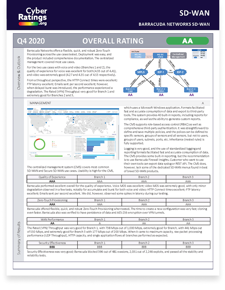 Barracuda Networks offers a flexible, quick, and robust Zero-Touch Provisioning across the use cases tested. Deployment was easy, and the product included comprehensive documentation. The centralized management covered most use cases. For the two use cases with voice and video (Branches 1 and 2), the quality of experience for voice was excellent for both (4.33 out of 4.41), and video was extremely good (4.27 and 4.35 out of 4.53 respectively). From a throughout perspective, the HTTP Connect times were excellent; FTP latency excellent; Emails sent per second excellent; however, when delayed burst was introduced, the performance experienced a degradation. The Rated (VPN) Throughput very good for Branch 1 and extremely good for Branches 2 and 3.