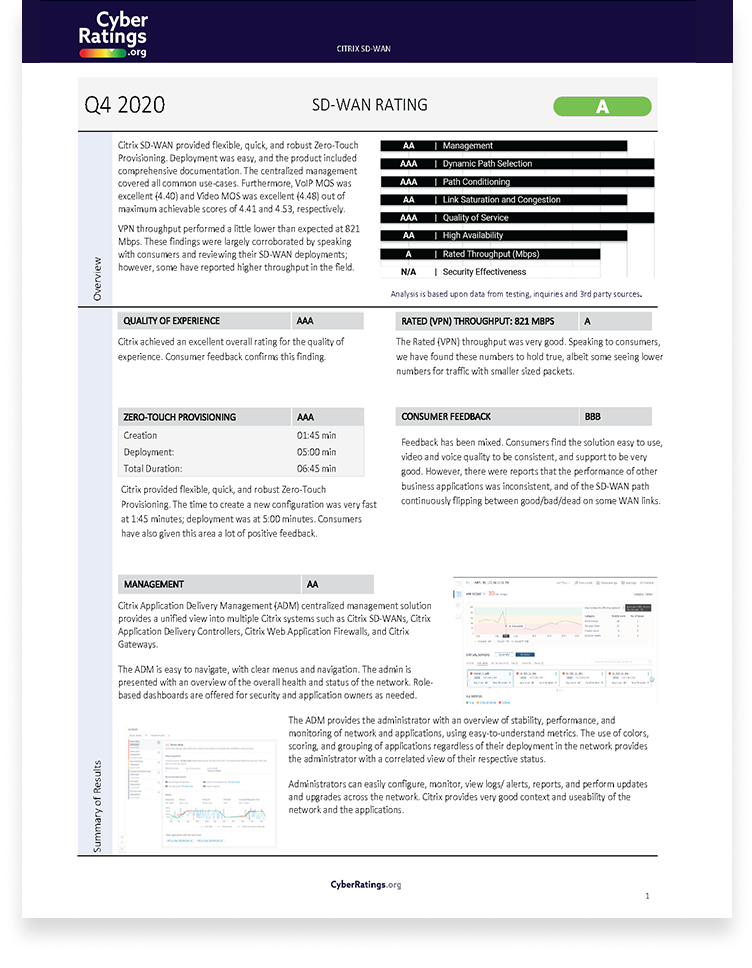 Citrix SD-WAN provided flexible, quick, and robust Zero-Touch Provisioning. Deployment was easy, and the product included comprehensive documentation. The centralized management covered all common use-cases. Furthermore, VoIP MOS was excellent (4.40) and Video MOS was excellent(4.48) out of maximum achievable scores of 4.41 and 4.53, respectively.VPN throughput performed a little lower than expected at 821Mbps. These findings werelargelycorroborated by speakingwith consumers and reviewing their SD-WANdeployments;however, some have reported higher throughput in the field