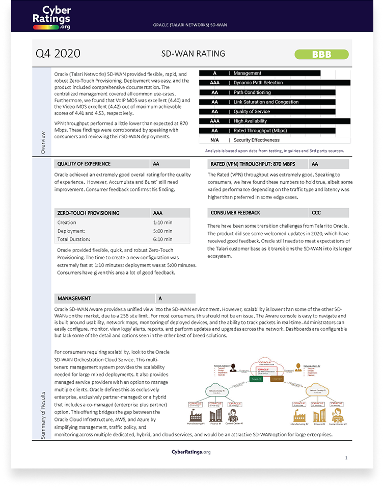 Oracle (Talari Networks) SD-WAN provided flexible, rapid, and robust Zero-Touch Provisioning. Deployment was easy, and the product included comprehensive documentation. The centralized management covered all common use-cases. Furthermore, we found that VoIP MOS was excellent (4.40) and the Video MOS excellent (4.42) out of maximum achievable scores of 4.41 and 4.53, respectively. VPN throughput performed a little lower than expected at 870 Mbps. These findings were corroborated by speaking with consumers and reviewing their SD-WAN deployments.