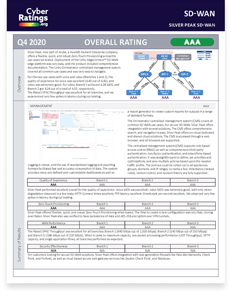 Silver Peak, now part of Aruba, a Hewlett Packard Enterprise company,offers a flexible, quick, and robust Zero-Touch Provisioning across the use cases we tested. Deployment of the Unity EdgeConnect™ SD-WAN edge platform was very easy, and the product included comprehensive documentation. The Unity Orchestrator centralized management system covered all common use cases and was very easy to navigate. For the two use cases with voice and video (Branches 1 and 2), the quality of experience for voice was excellent (4.40 out of 4.41), and video was extremely good. For video, Branch 1 achieved 4.28 MOS, and Branch 2 got 4.26 out of a total of 4.53, respectively. The Rated (VPN) Throughput was excellent for all branches, and we experienced very few spikes in latency during our testing.