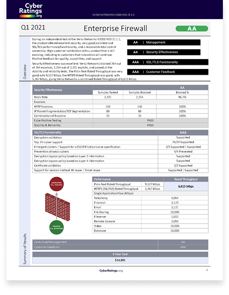 During an independent test of the Versa Networks V2000 VOS 21.1.1, the product offered excellent security, very good plain text and SSL/TLS performance/functionality, and a reasonable total cost of ownership. High customer satisfaction with a product that is still evolving, indicating to customers that innovation will continue. Positive feedback for quality, capabilities, and support. Security Effectiveness was excellent; Versa Networks blocked 264 out of 264 evasions, 2,254 out of 2,331 exploits, and passed all the stability and reliability tests. The Plain Text Rated Throughput was very good with 9,527 Mbps, the HTTPS Rated Throughput was good, with5,367Mbps, giving Versa Networks a combined Rated Throughput of 6,615 Mbps.