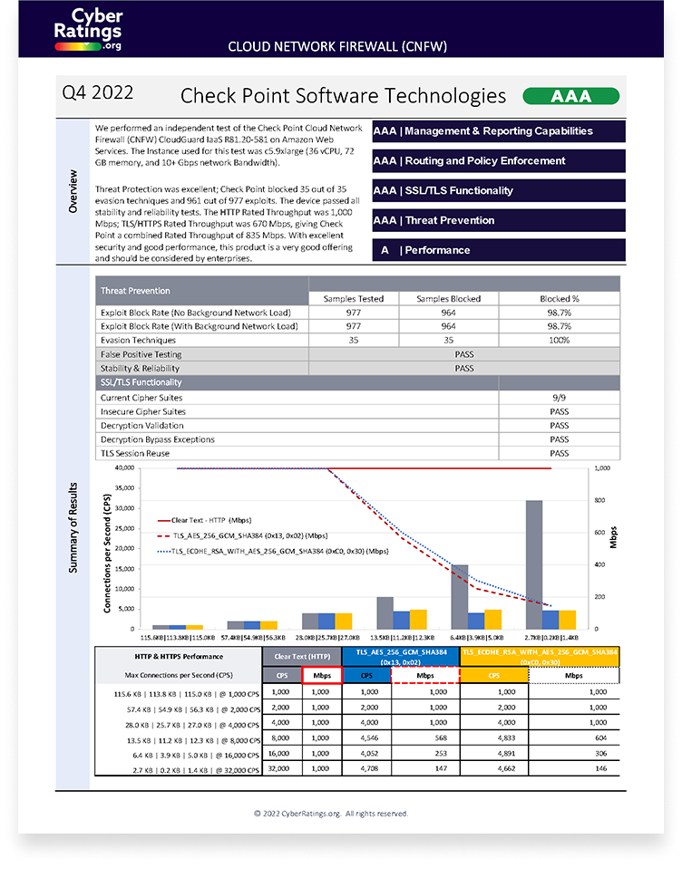 We performed an independent test of the Check Point Cloud Network Firewall (CNFW) CloudGuard IaaS R81.20-581 on Amazon Web Services. The Instance used for this test was c5.9xlarge (36 vCPU, 72 GB memory, and 10+ Gbps network Bandwidth). Threat Protection was excellent; Check Point blocked 35 out of 35 evasion techniques and 961out of 977 exploits. The device passed all stability and reliability tests. The HTTP Rated Throughput was 1,000 Mbps; TLS/HTTPS Rated Throughput was 670 Mbps, giving CheckPoint a combined Rated Throughput of 835 Mbps. With excellent security and good performance, this product is a very good offering and should be considered by enterprises.