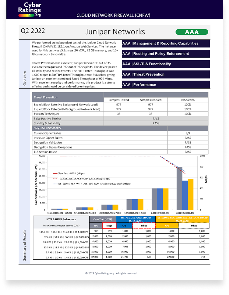 We performed an independent test of the Juniper Cloud Network Firewall (CNFW) 22.1R1.1 on Amazon Web Services. The Instance used for this test was c5.9xlarge (36 vCPU, 72 GB memory, and 10+ Gbps network Bandwidth). Threat Protection was excellent; Juniper blocked 35 out of 35 evasion techniques and 977out of 977 exploits. The device passed all stability and reliability tests. The HTTP Rated Throughput was 1,000 Mbps; TLS/ HTTPS Rated Throughput was 948 Mbps, giving Juniper an excellent combined Rated Throughput of 974Mbps. With excellent security and performance, this product is a strong offering and should be considered by enterprises.