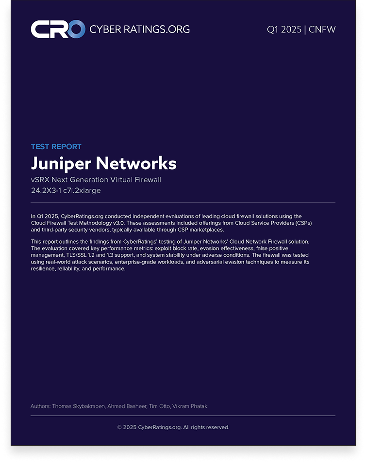 In Q1 2025, CyberRatings.org conducted independent evaluations of leading cloud firewall solutions using the Cloud Firewall Test Methodology v3.0. These assessments included offerings from Cloud Service Providers (CSPs) and third-party security vendors, typically available through CSP marketplaces. This report outlines the findings from CyberRatings’ testing of Juniper Networks’ Cloud Network Firewall solution.