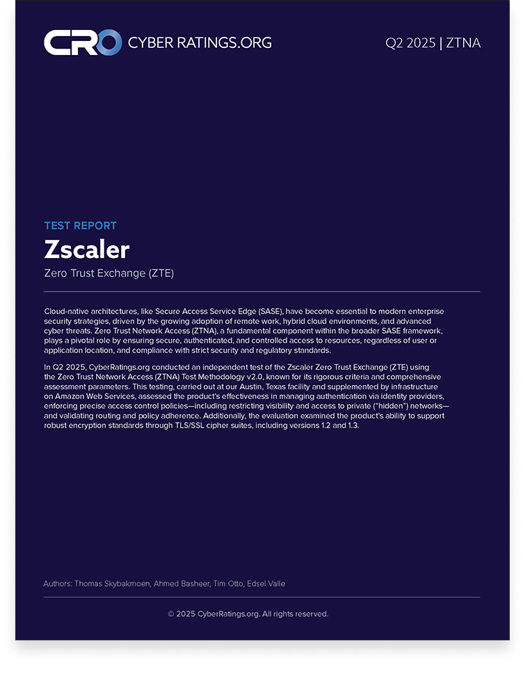 In Q2 2025, CyberRatings.org conducted an independent test of the Zscaler Zero Trust Exchange (ZTE) using the Zero Trust Network Access (ZTNA) Test Methodology v2.0, known for its rigorous criteria and comprehensive assessment parameters. This testing, carried out at our Austin, Texas facility and supplemented by infrastructure on Amazon Web Services, assessed the product’s e ectiveness in managing authentication via identity providers, enforcing precise access control policies—including restricting visibility and access to private (“hidden”) networks—and validating routing and policy adherence. Additionally, the evaluation examined the product’s ability to support robust encryption standards through TLS/SSL cipher suites, including versions 1.2 and 1.3.