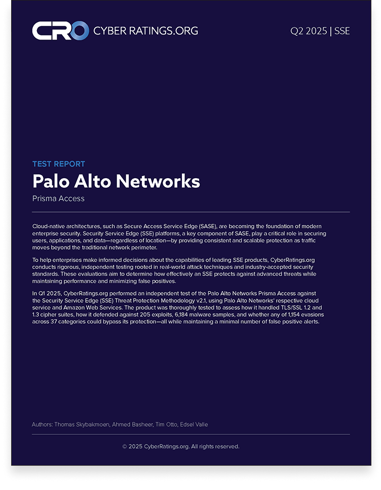 In Q1 2025, CyberRatings.org performed an independent test of the Palo Alto Networks Prisma Access against the Security Service Edge (SSE) Threat Protection Methodology v2.1, using Palo Alto Networks’ respective cloud service and Amazon Web Services. The product was thoroughly tested to assess how it handled TLS/SSL 1.2 and 1.3 cipher suites, how it defended against 205 exploits, 6,184 malware samples, and whether any of 1,154 evasions across 37 categories could bypass its protection—all while maintaining a minimal number of false positive alerts.