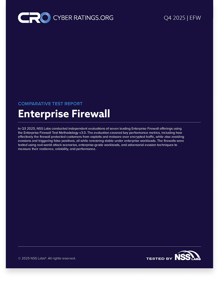 In Q3 2025, NSS Labs conducted independent evaluations of seven leading Enterprise Firewall offerings using the Enterprise Firewall Test Methodology v3.0. The evaluation covered key performance metrics, including how effectively the firewall protected customers from exploits and malware over encrypted traffic, while also avoiding evasions and triggering false positives, all while remaining stable under enterprise workloads. The firewalls were tested using real-world attack scenarios, enterprise-grade workloads, and adversarial evasion techniques to measure their resilience, reliability, and performance.